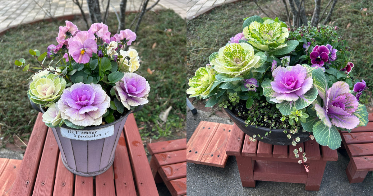 昨年末に作成した寄せ植えのうち、葉ボタンがいい感じに整ってきました。