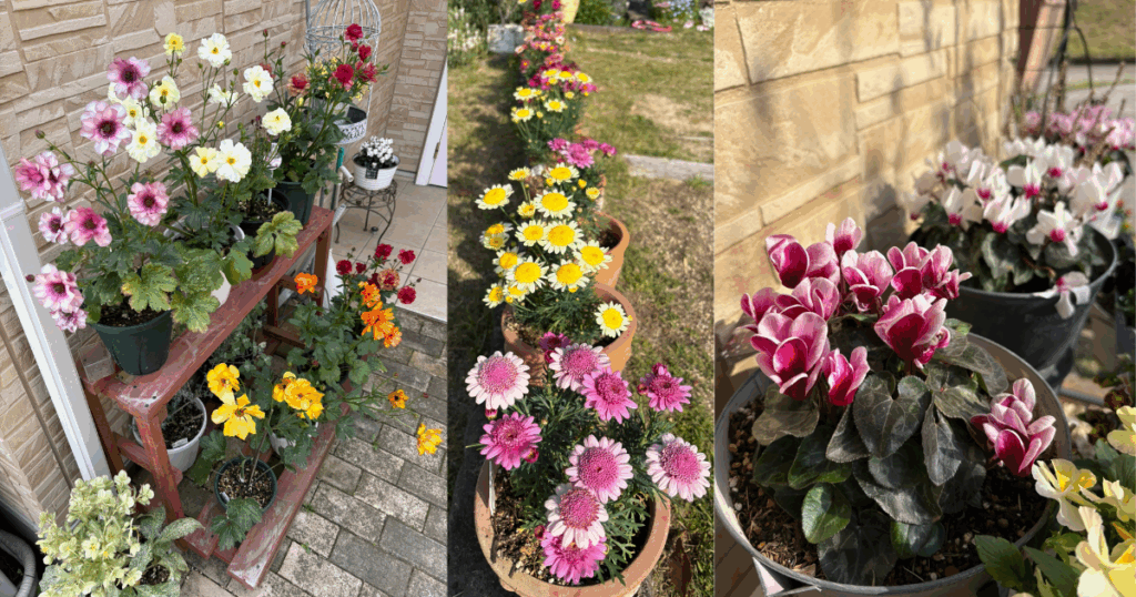 ラックスラナンキュラス、マーガレットも後追いしてきました。シクラメンも日当たりと水やりの調整で今年は長く咲いています。