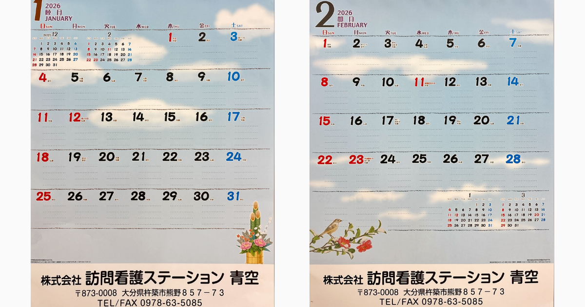 発注していた来年のカレンダーが届きました。毎年この時期に、利用者様や関連サービスの方々にお配りしています。青空を背景に月ごとの花や風景などが描かれたデザインで、利用者様が日々のスケジュール等を書き込みしやすいようにメモの欄と、下部にはステーションの住所・連絡先を掲示しています。通年デザインに変更なしで発注し続けてきましたが、来年はホームページのQRコードも追加しようか検討中です。
