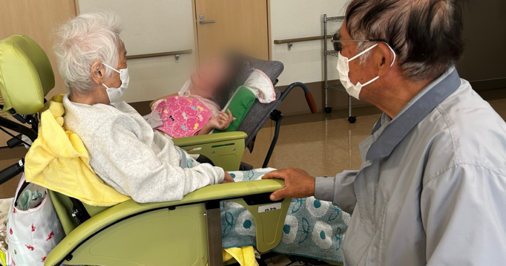 無事施設に到着し、お母様と面会です。お互い健側どうしで握手し、満面の笑みを浮かべています。