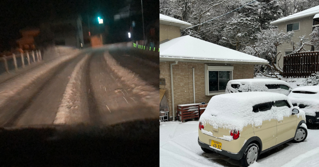 少し荒い画像ですが、左は2021年12月末に大寒波で2日ほど路面が凍結しました。右は2023年1月初旬の画像で雪の多いところでは20~30cm積もりました。どちらもスタットレスタイヤでなければ走行できませんでした。昨年末から今年にかけても、何回か道路が凍結すると予測し、スタットレスタイヤに変えていました。